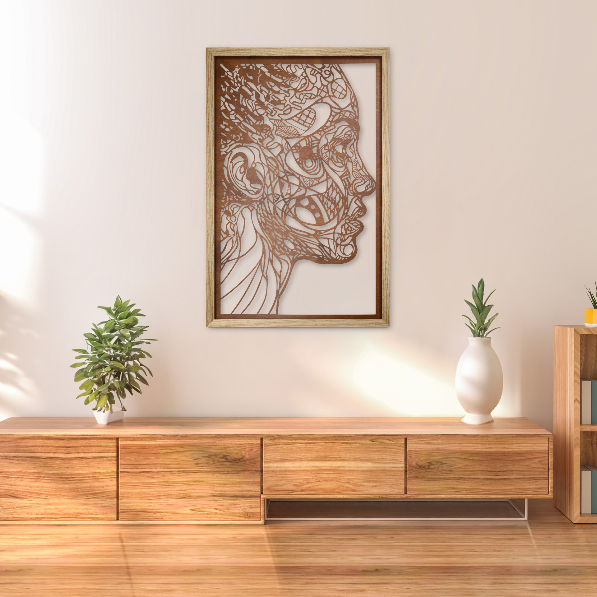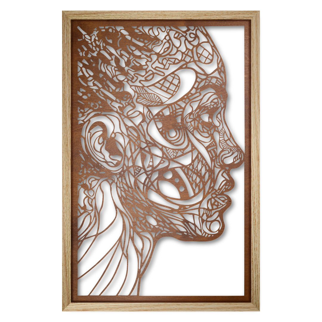 Obraz został stworzony z panelu wycinanego laserowo w sklejce drewnianej i osadzony w ramie z litego drewna dębowego o odpowiedniej grubości listew, aby otrzymać optymalne odsunięcie panelu od powierzchni ściany i uzyskać efekt przestrzenności obrazu.