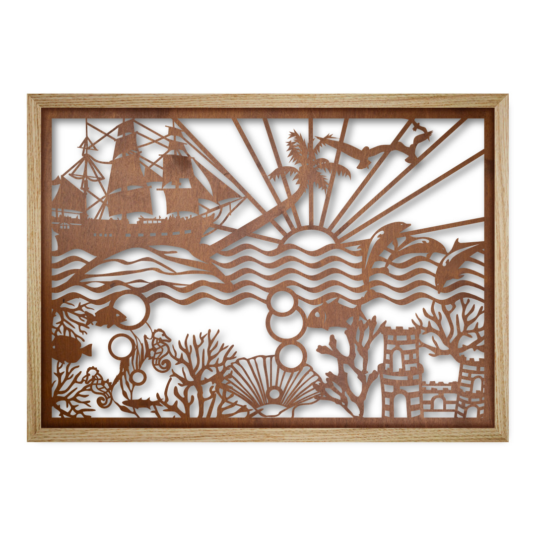 Obraz został stworzony z panelu wycinanego laserowo w sklejce drewnianej i osadzony w ramie z litego drewna dębowego o odpowiedniej grubości listew, aby otrzymać optymalne odsunięcie panelu od powierzchni ściany i uzyskać efekt przestrzenności obrazu.