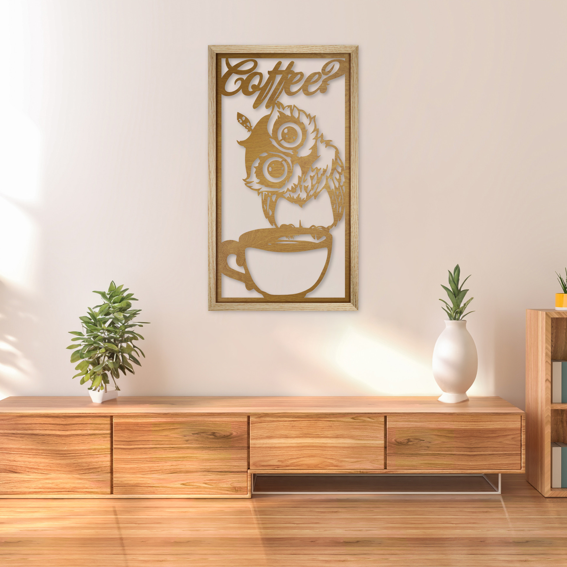 Obraz został stworzony z panelu wycinanego laserowo w sklejce drewnianej i osadzony w ramie z litego drewna dębowego o odpowiedniej grubości listew, aby otrzymać optymalne odsunięcie panelu od powierzchni ściany i uzyskać efekt przestrzenności obrazu.