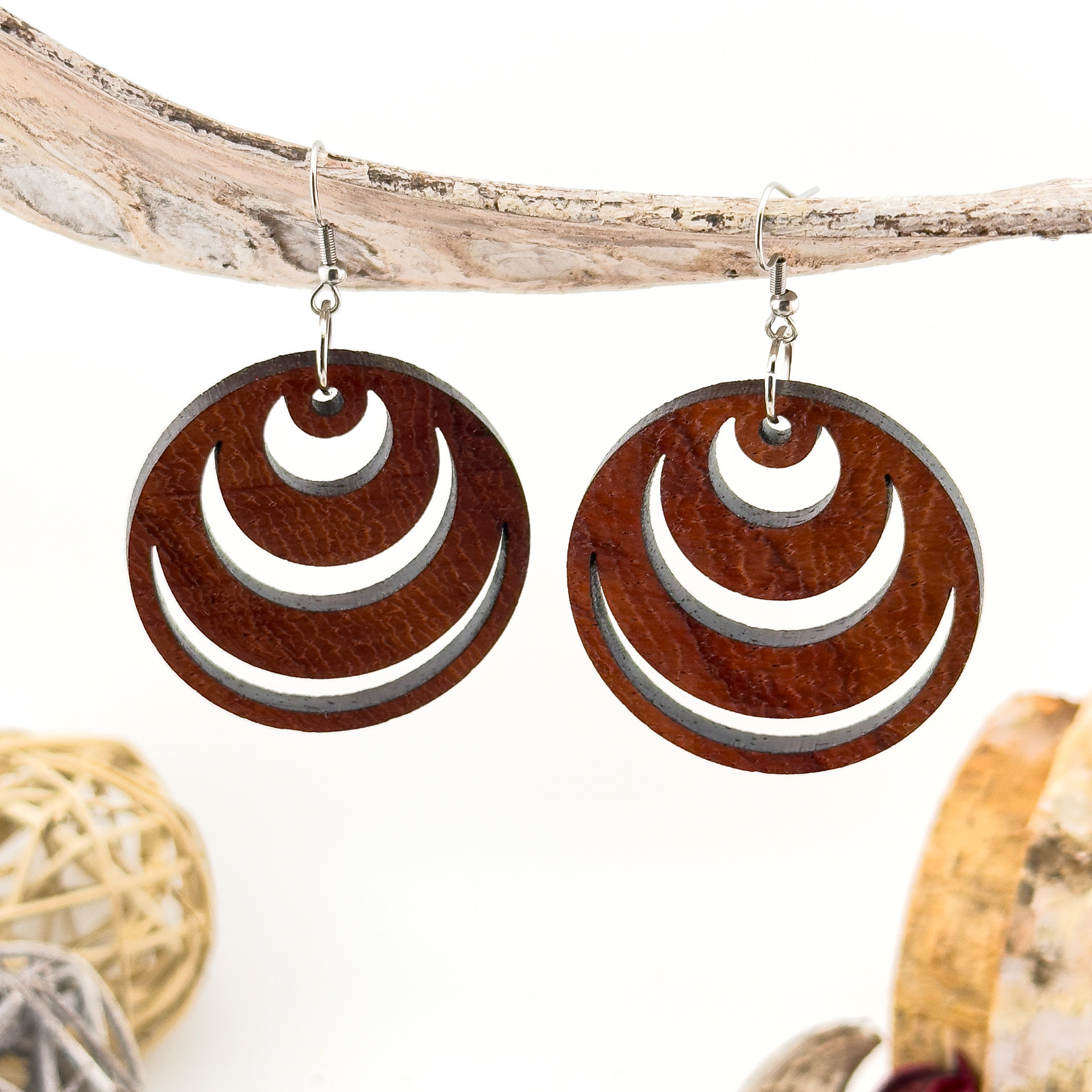 Kolczyki drewniane, drewno egzotyczne padouk, bigle ze stali chirurgicznej, projekt 1