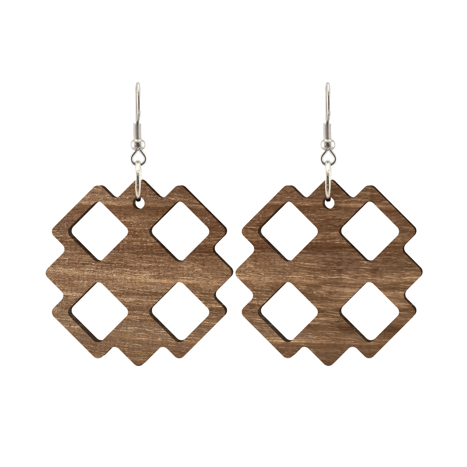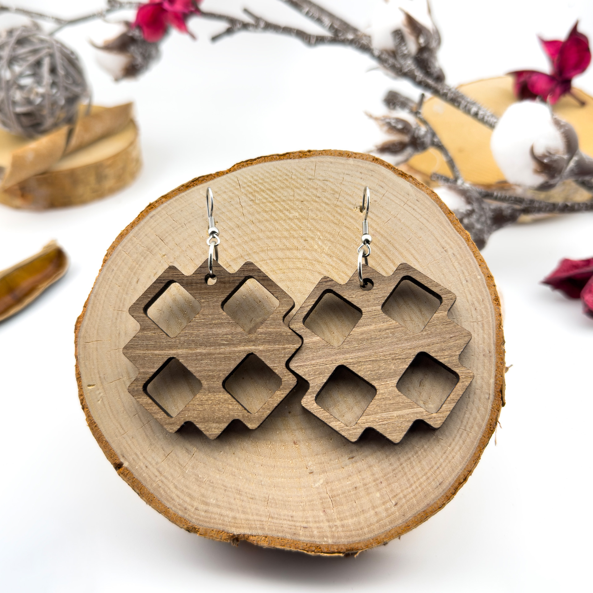 Kolczyki drewniane, orzech włoski, bigle ze stali chirurgicznej, projekt 2
