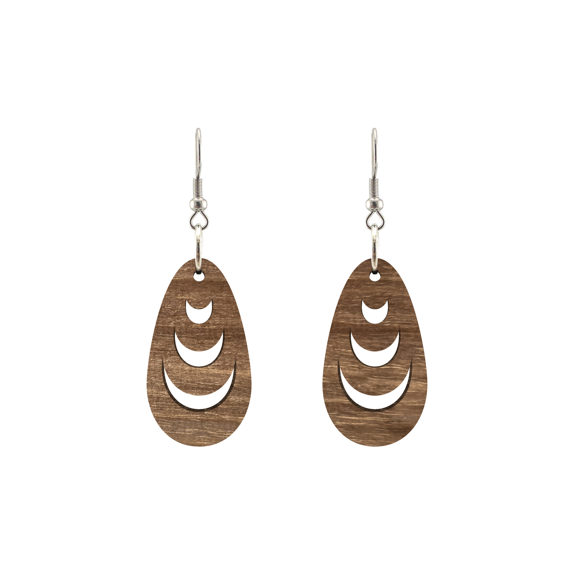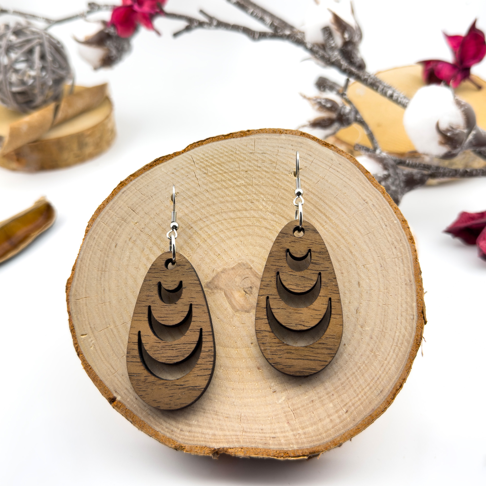 Kolczyki drewniane, orzech włoski, bigle ze stali chirurgicznej, projekt 5