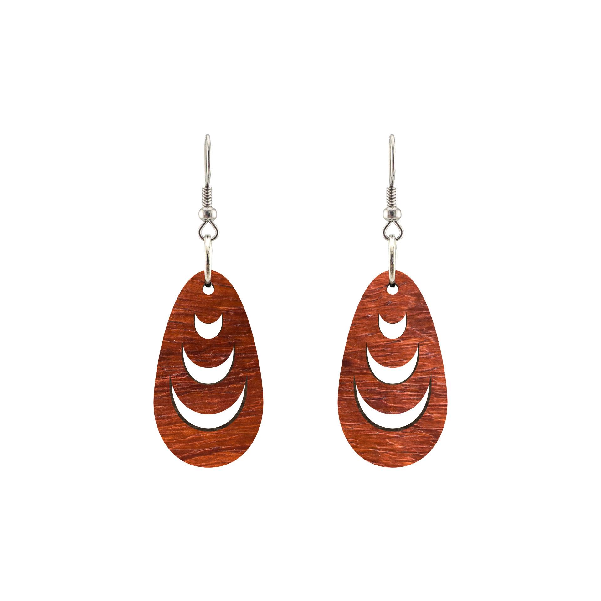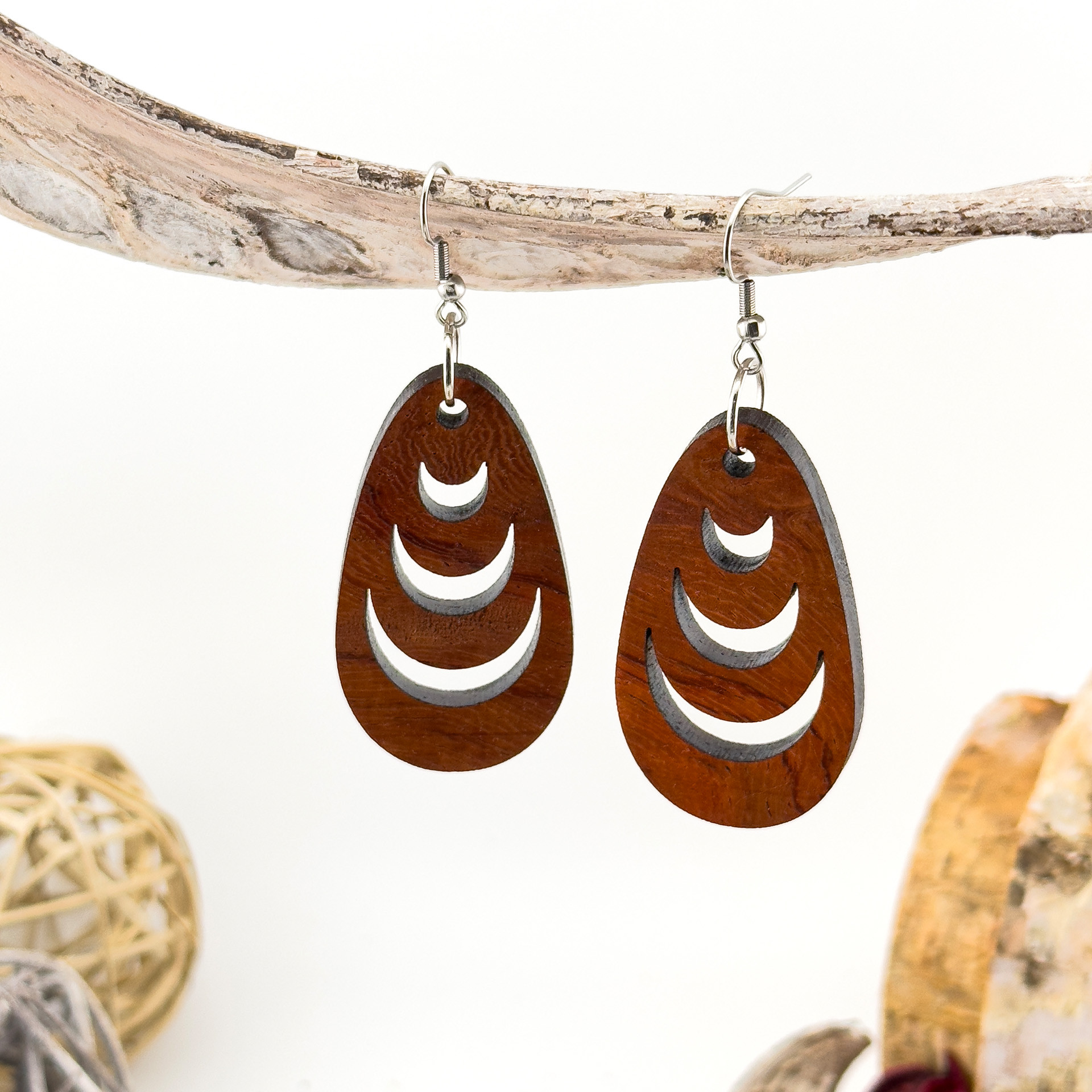 Kolczyki drewniane, drewno egzotyczne padouk, bigle ze stali chirurgicznej, projekt 5