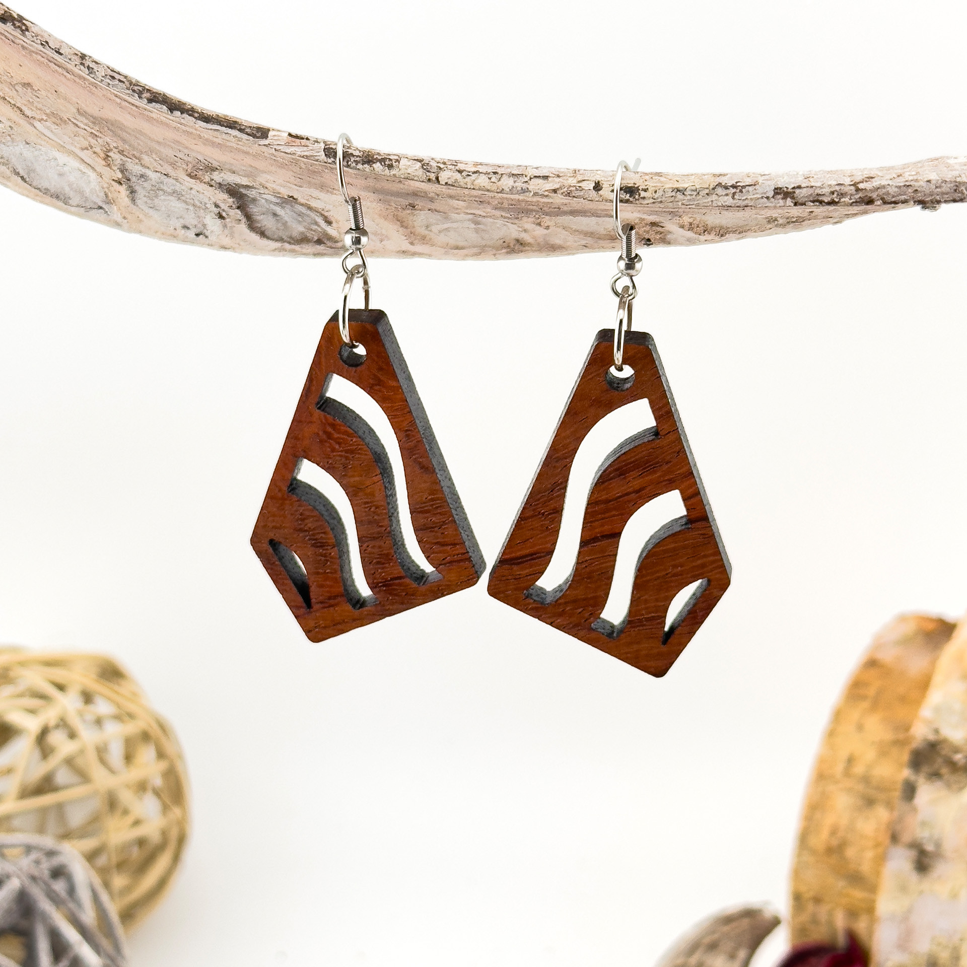 Kolczyki drewniane, drewno egzotyczne padouk, bigle ze stali chirurgicznej, projekt 7