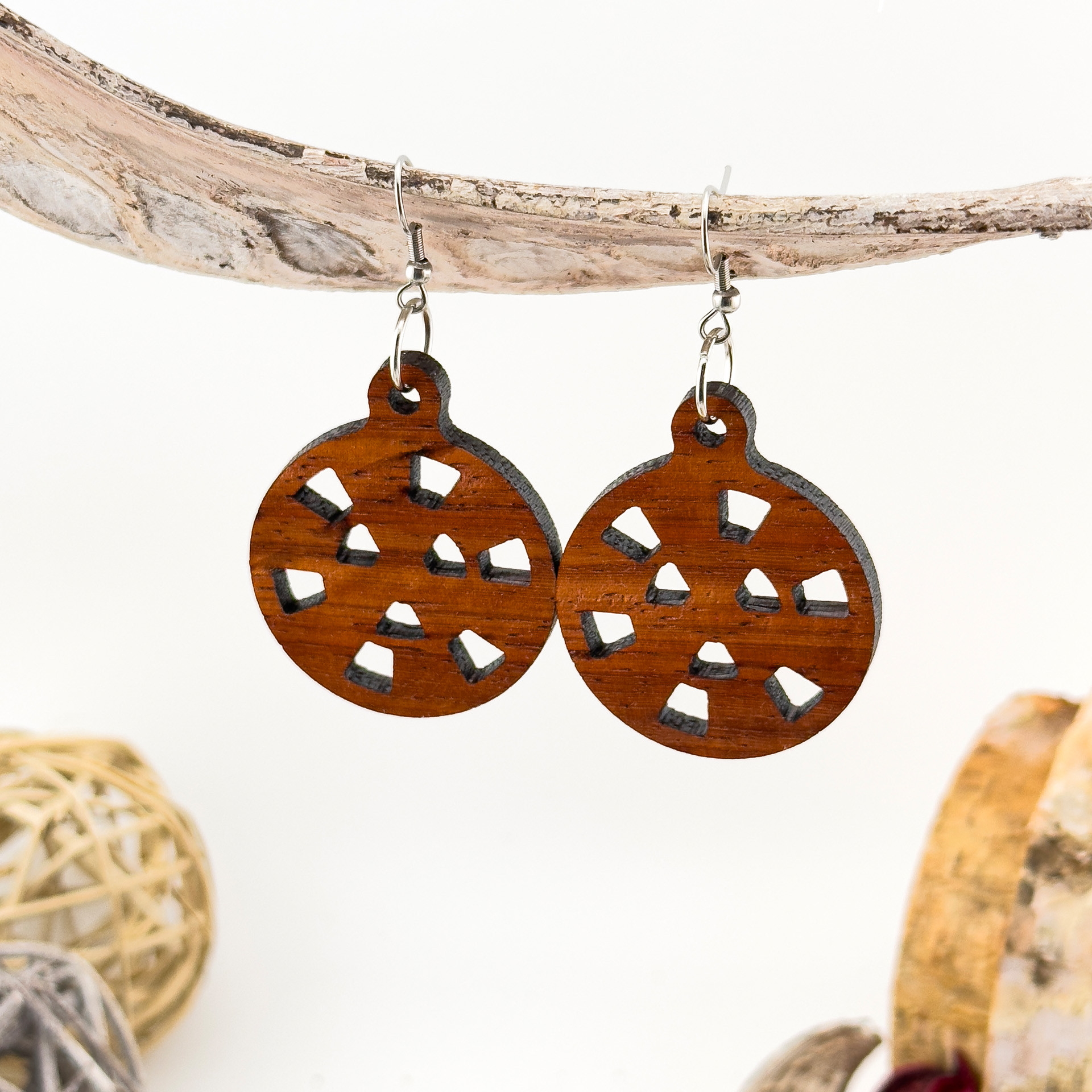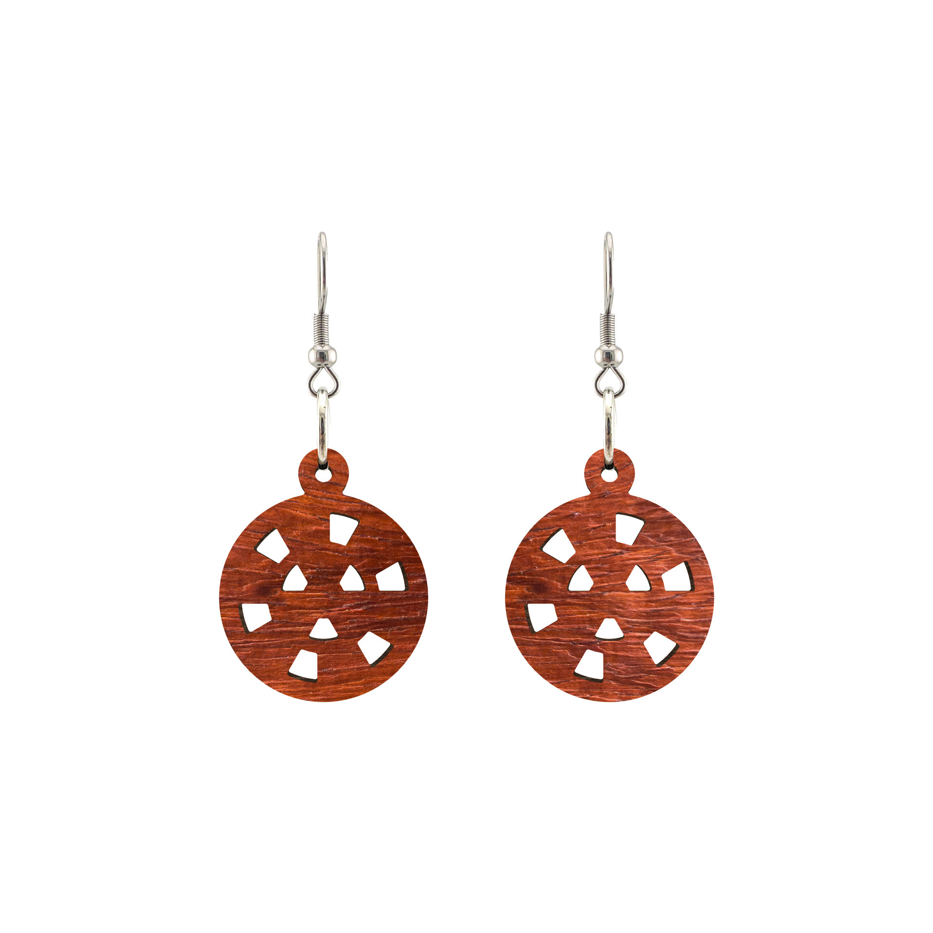 Kolczyki drewniane, drewno egzotyczne padouk, bigle ze stali chirurgicznej, projekt 8