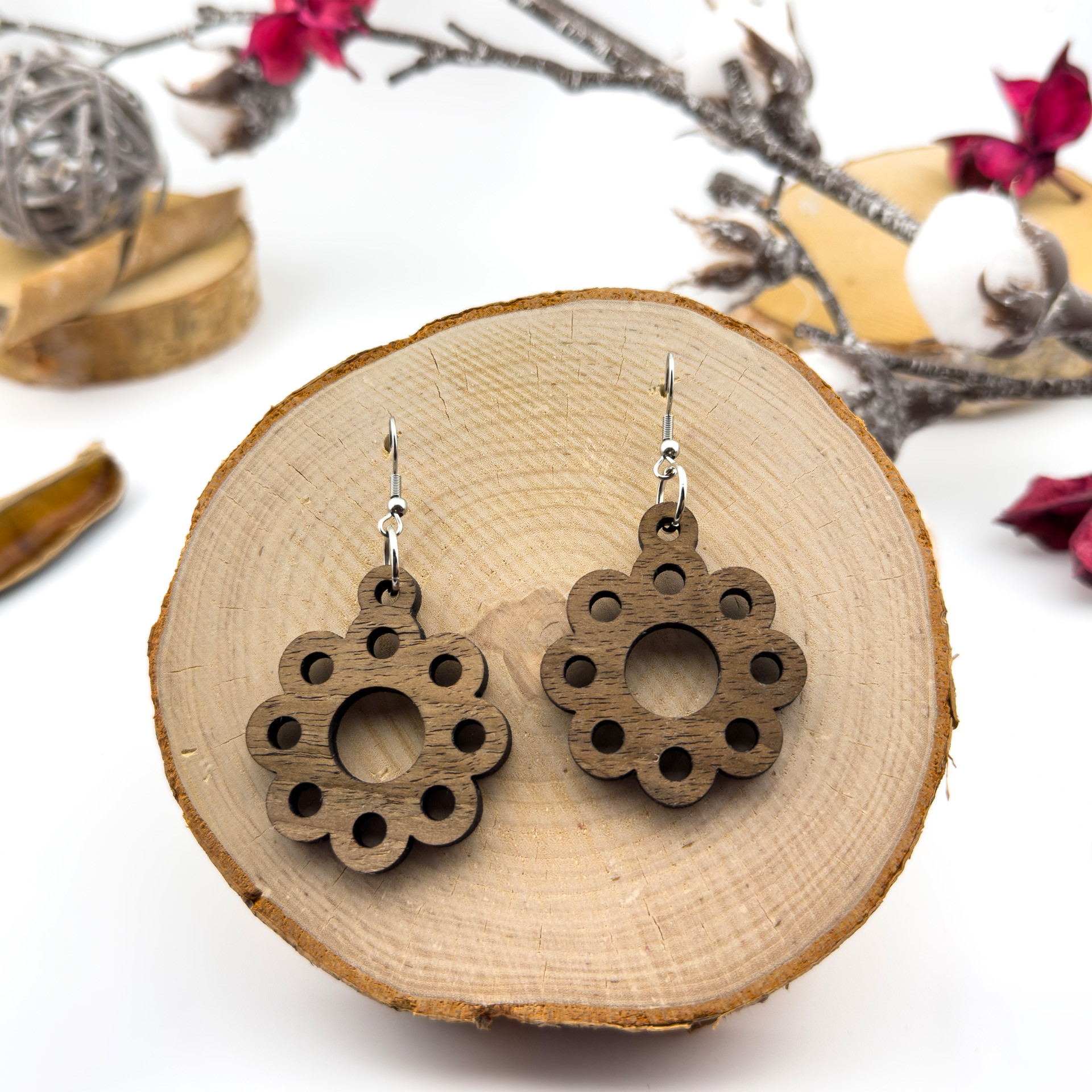 Kolczyki drewniane, orzech włoski, bigle ze stali chirurgicznej, projekt 12