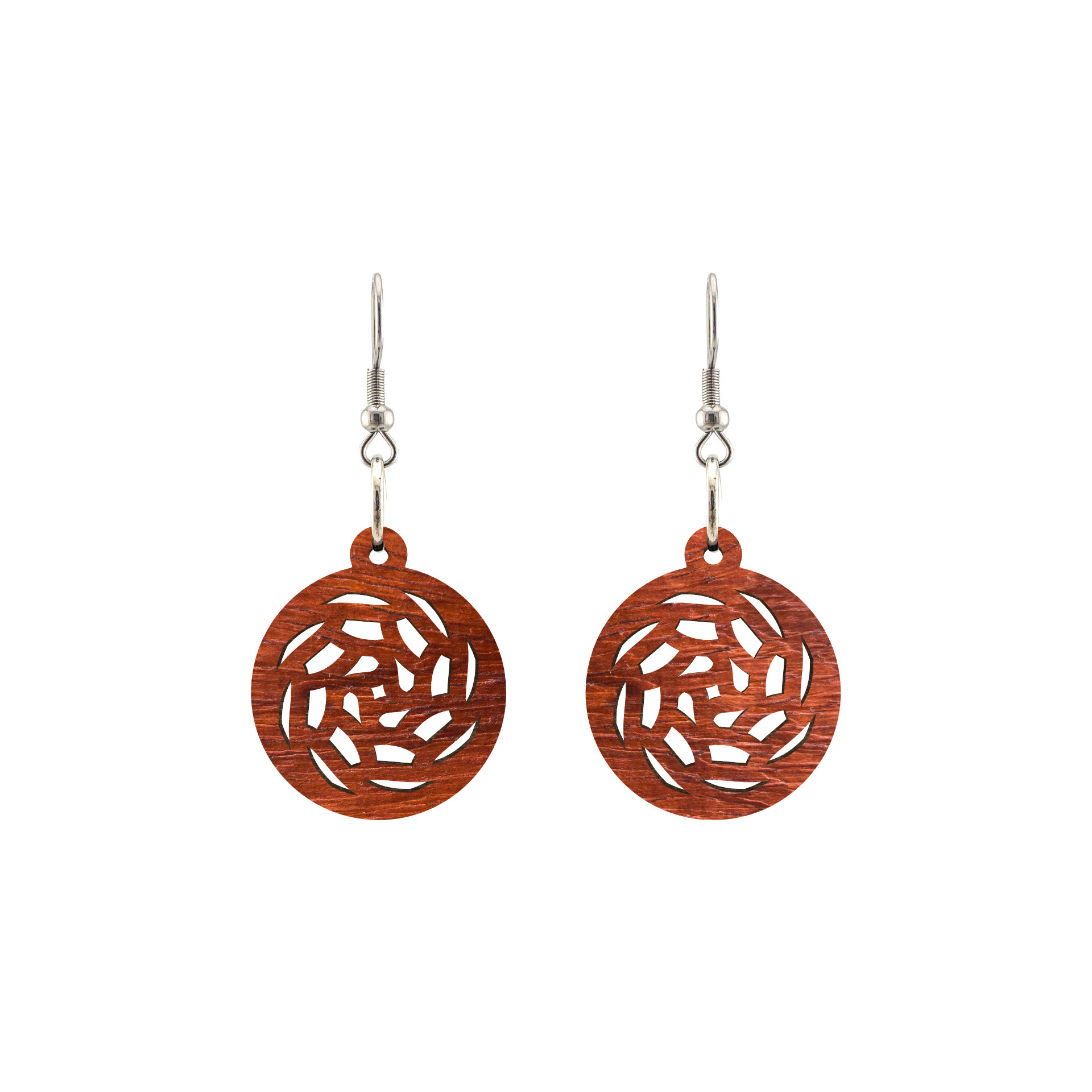 Kolczyki drewniane, drewno egzotyczne padouk, bigle ze stali chirurgicznej, projekt 16