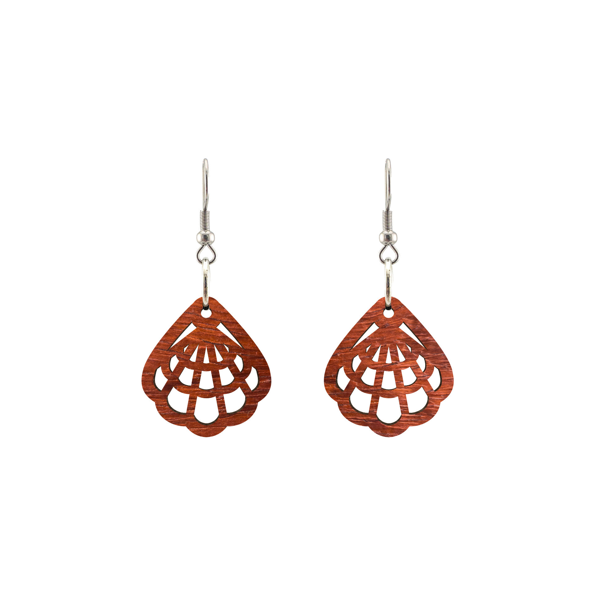 Kolczyki drewniane, drewno egzotyczne padouk, bigle ze stali chirurgicznej, projekt 18