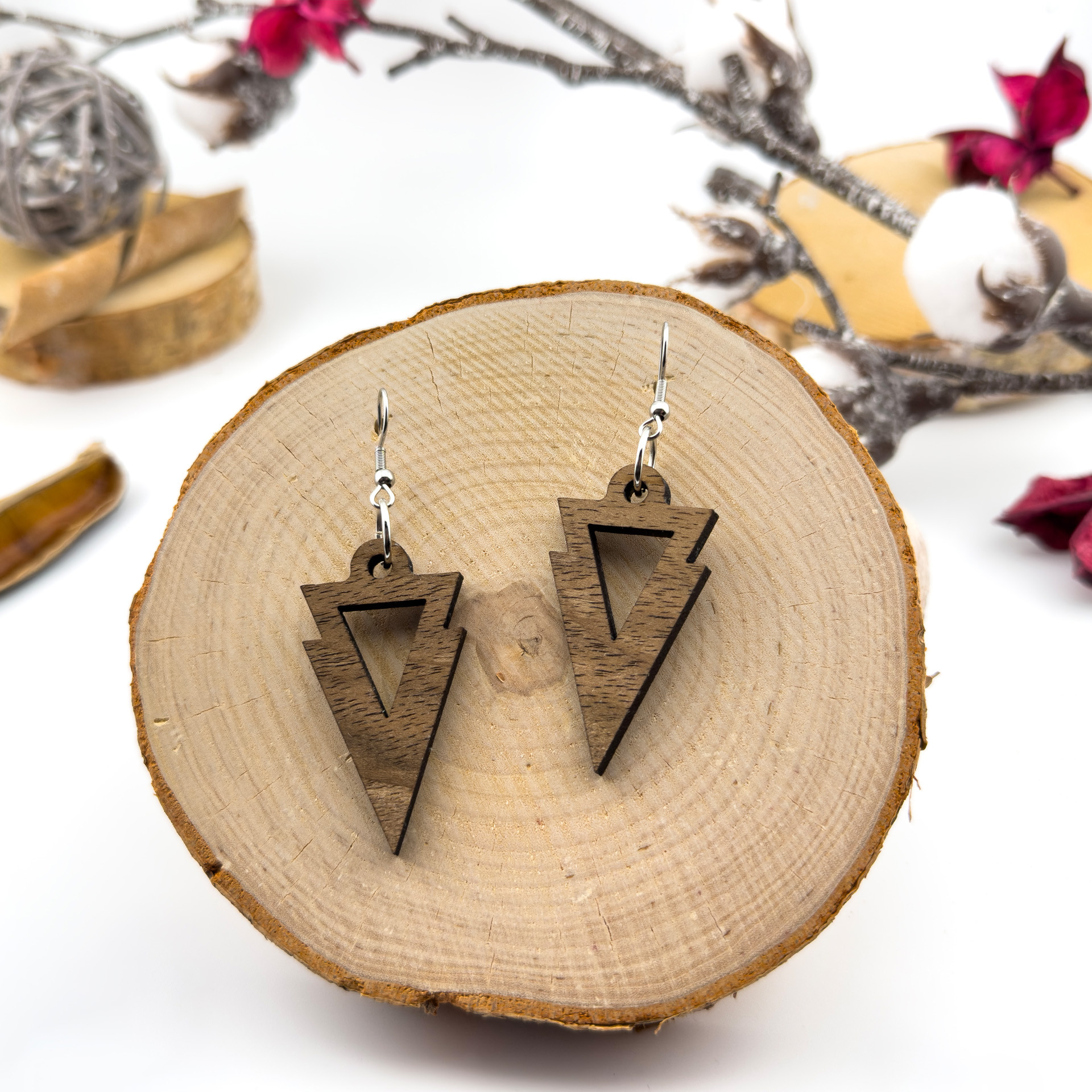 Kolczyki drewniane, orzech włoski, bigle ze stali chirurgicznej, projekt 21