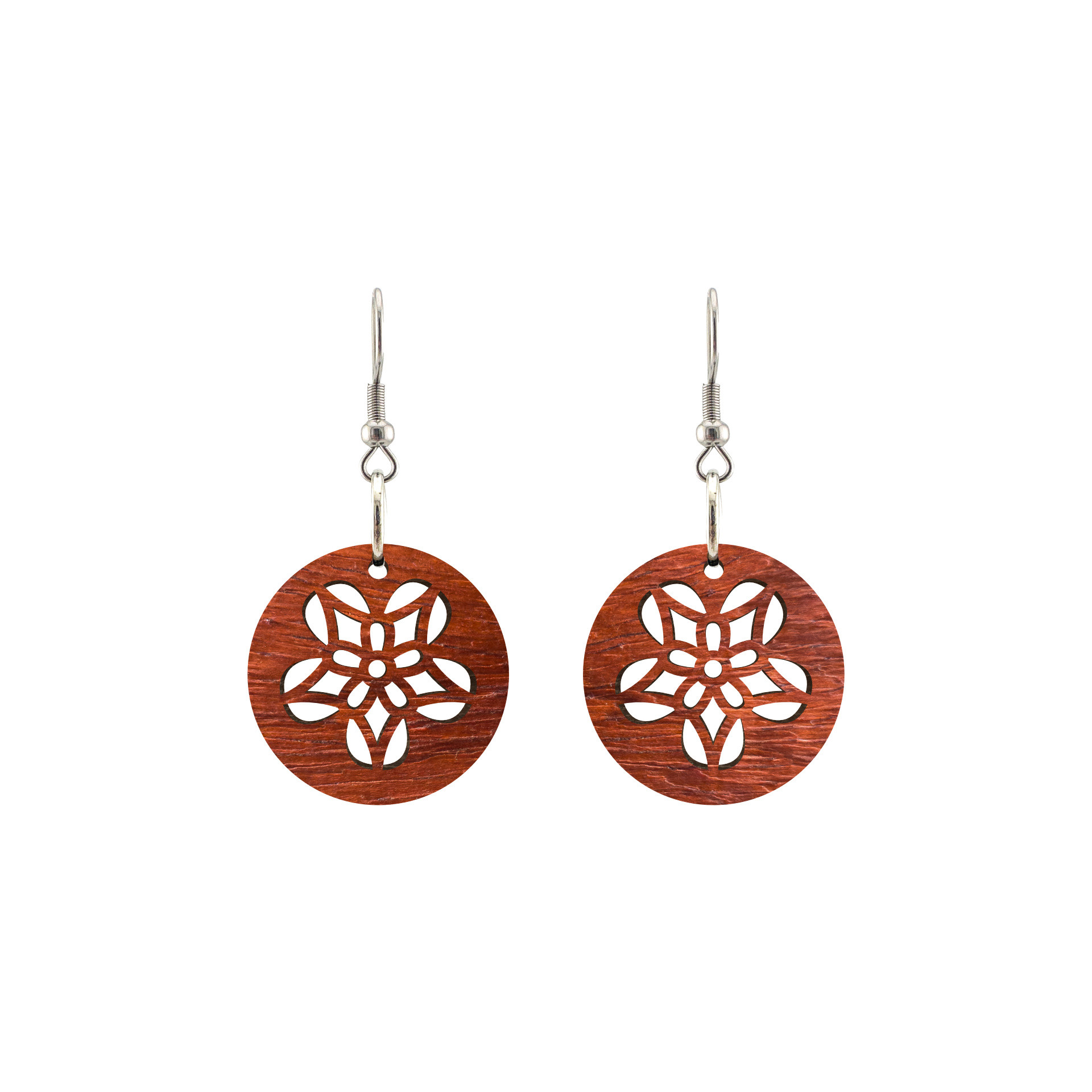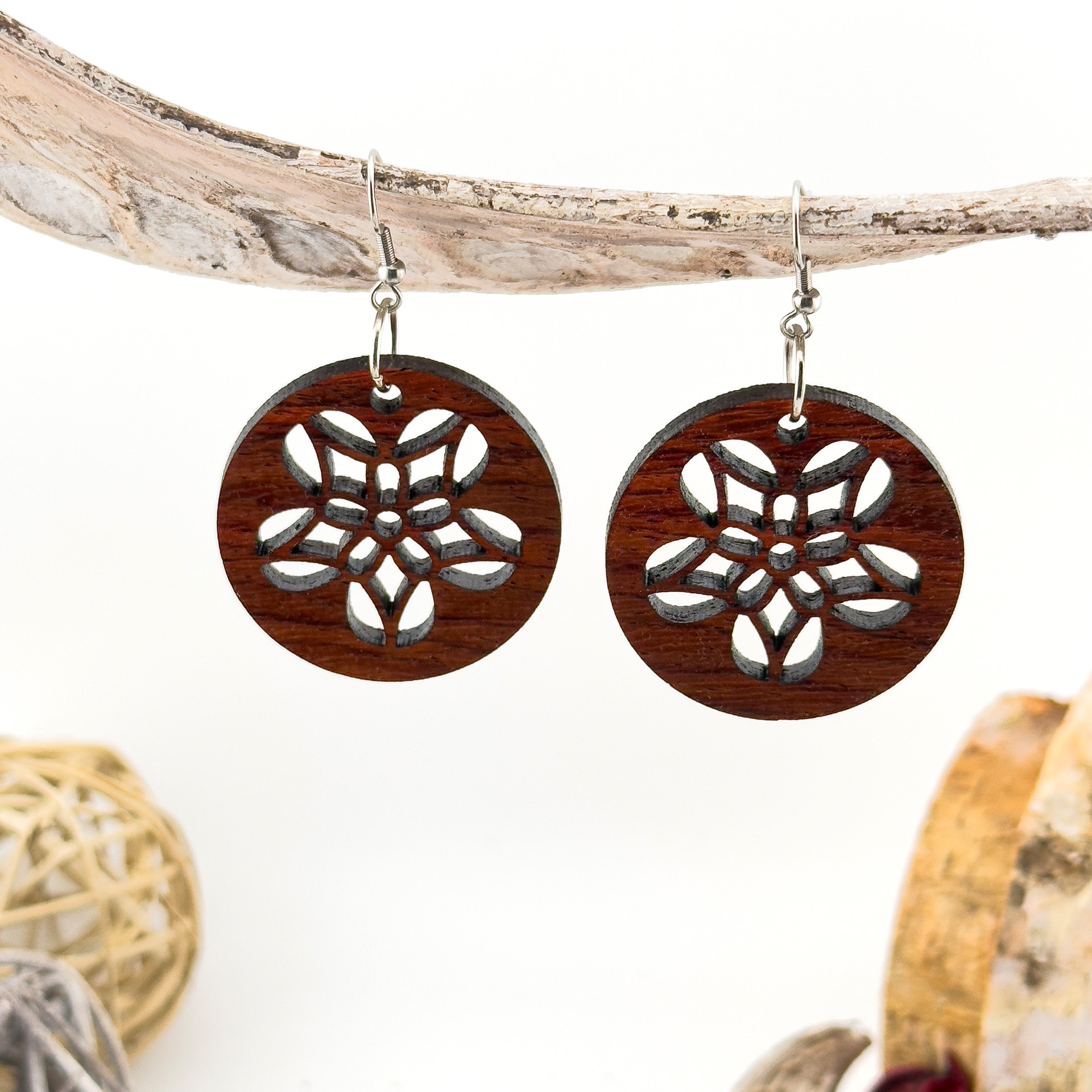 Kolczyki drewniane, drewno egzotyczne padouk, bigle ze stali chirurgicznej, projekt 26