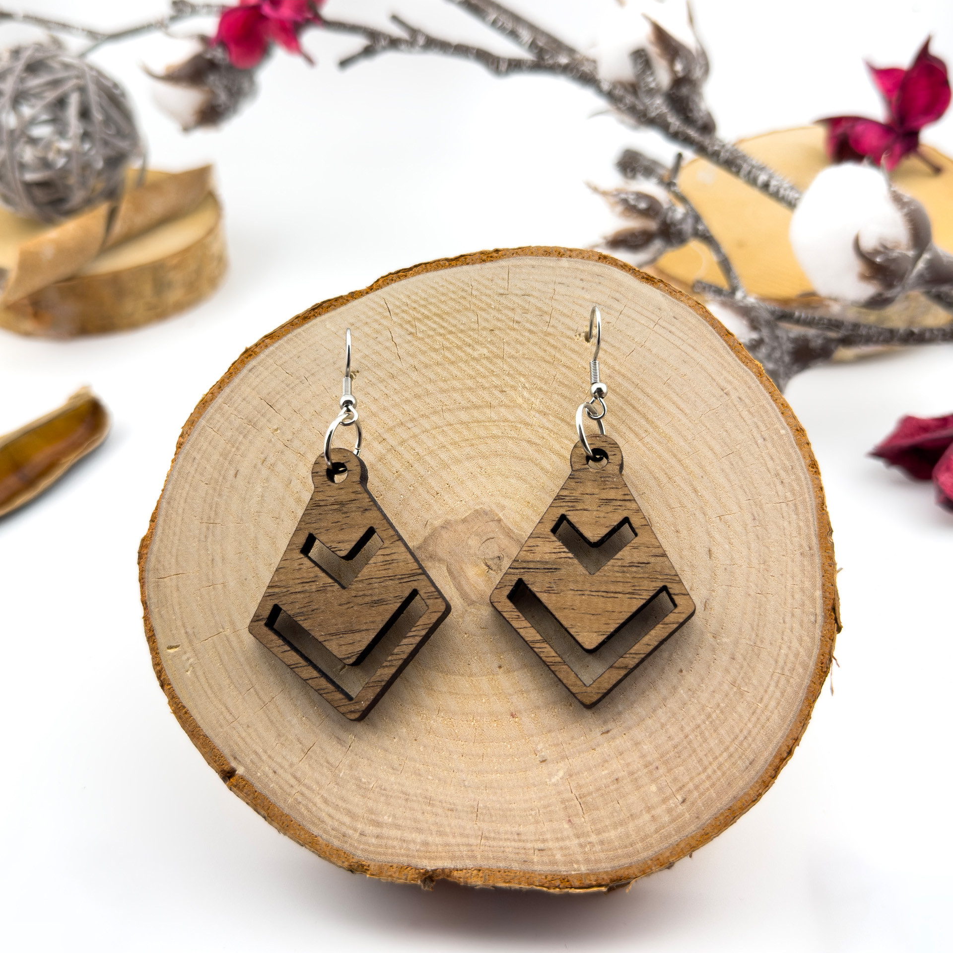 Kolczyki drewniane, orzech włoski, bigle ze stali chirurgicznej, projekt 27