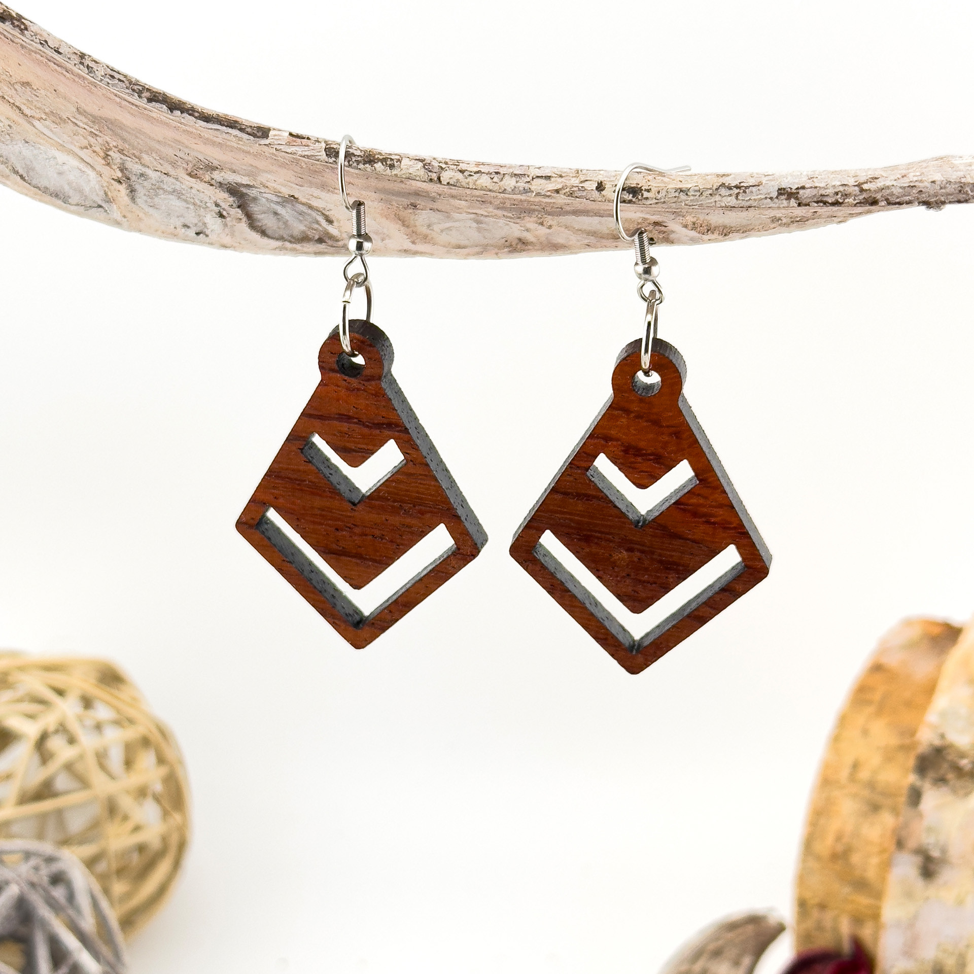 Kolczyki drewniane, drewno egzotyczne padouk, bigle ze stali chirurgicznej, projekt 27