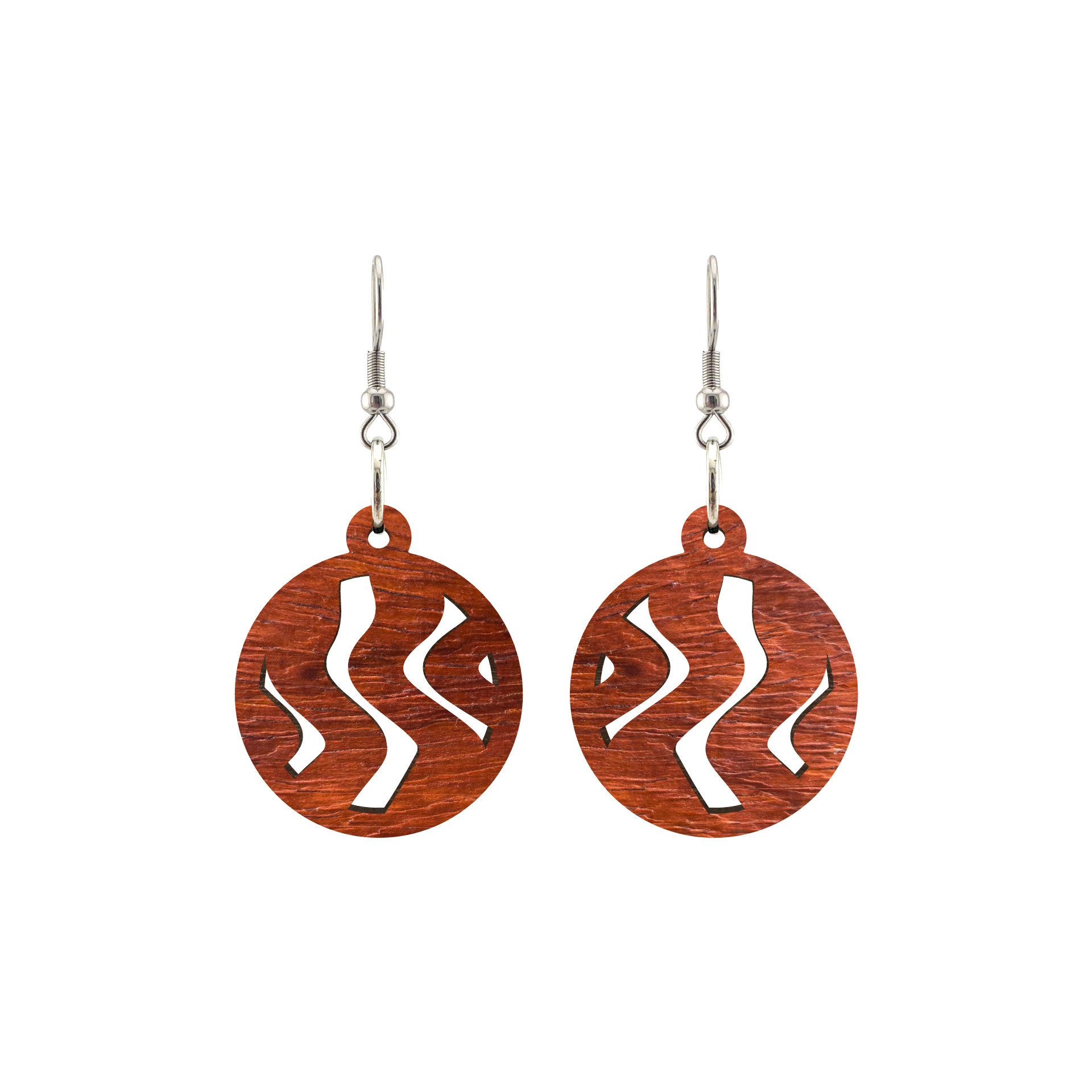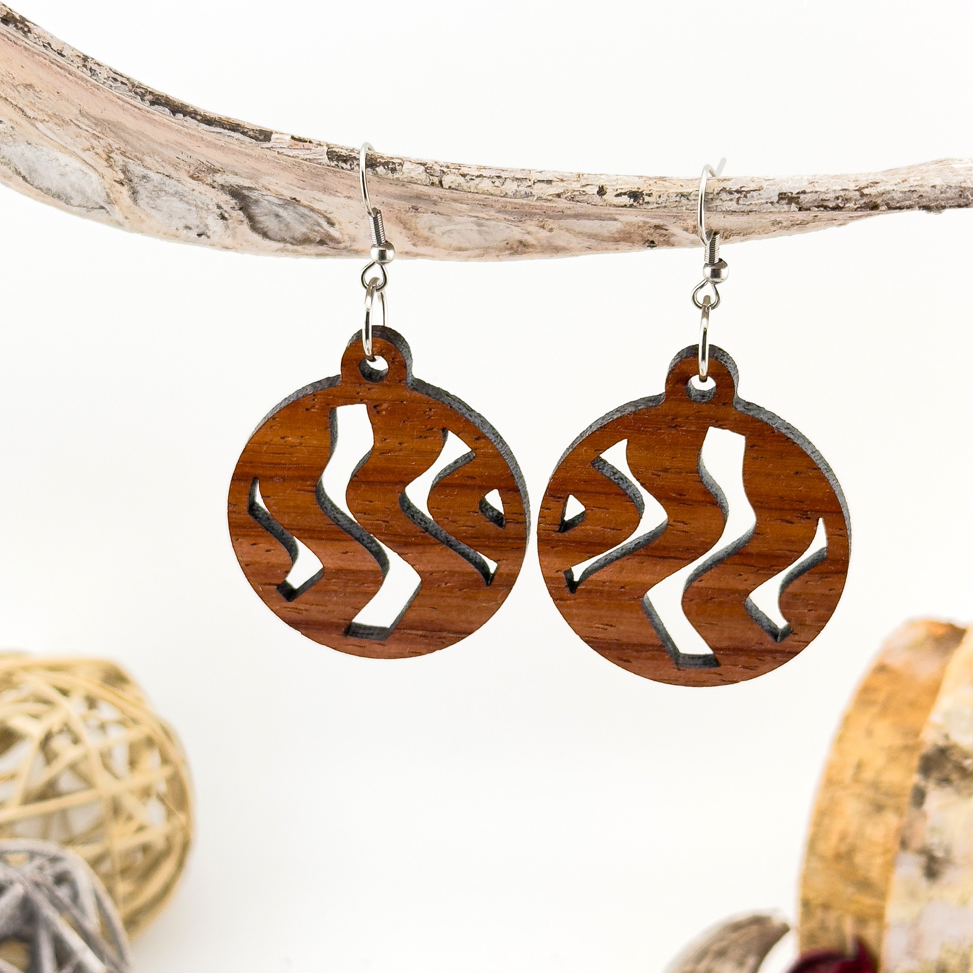 Kolczyki drewniane, drewno egzotyczne padouk, bigle ze stali chirurgicznej, projekt 29