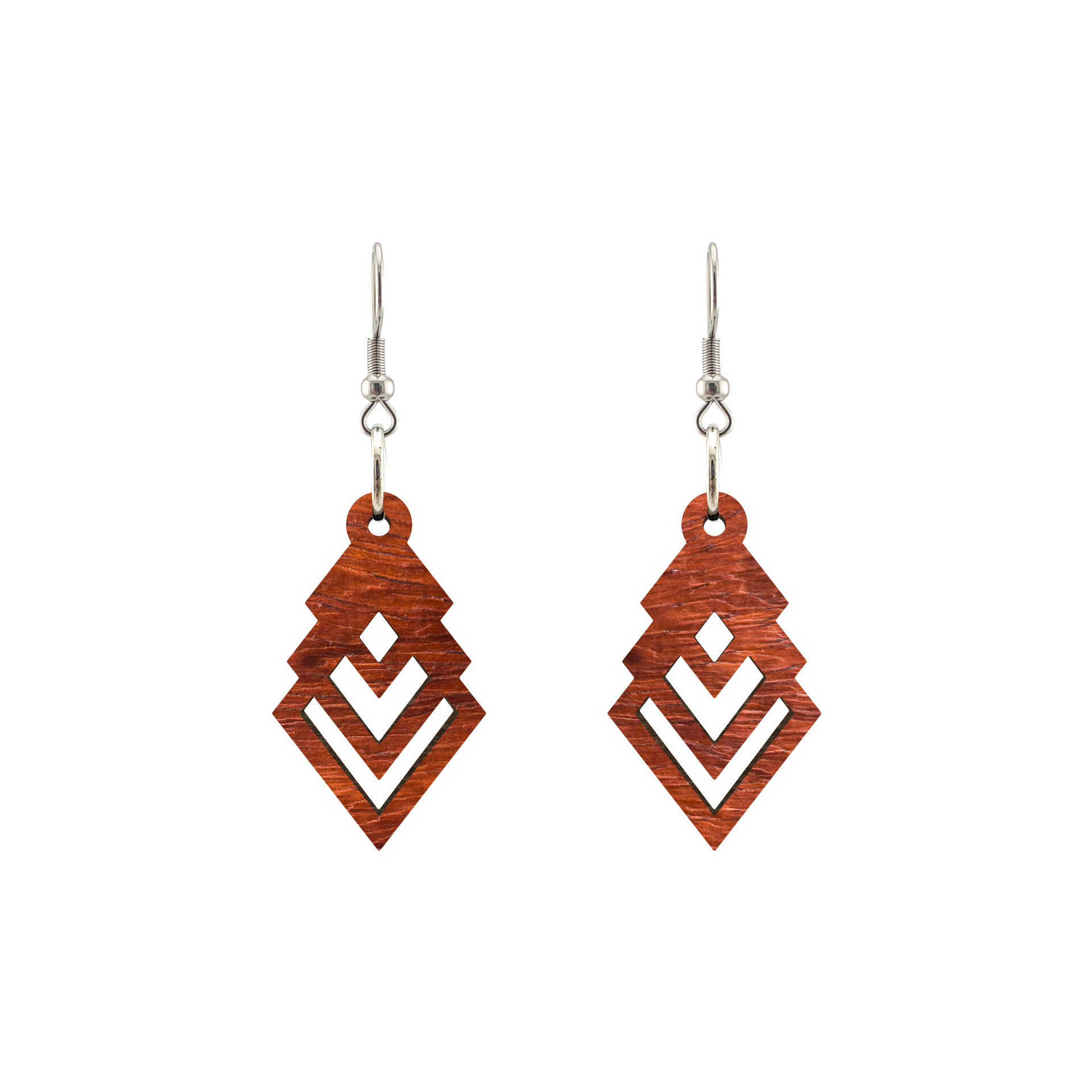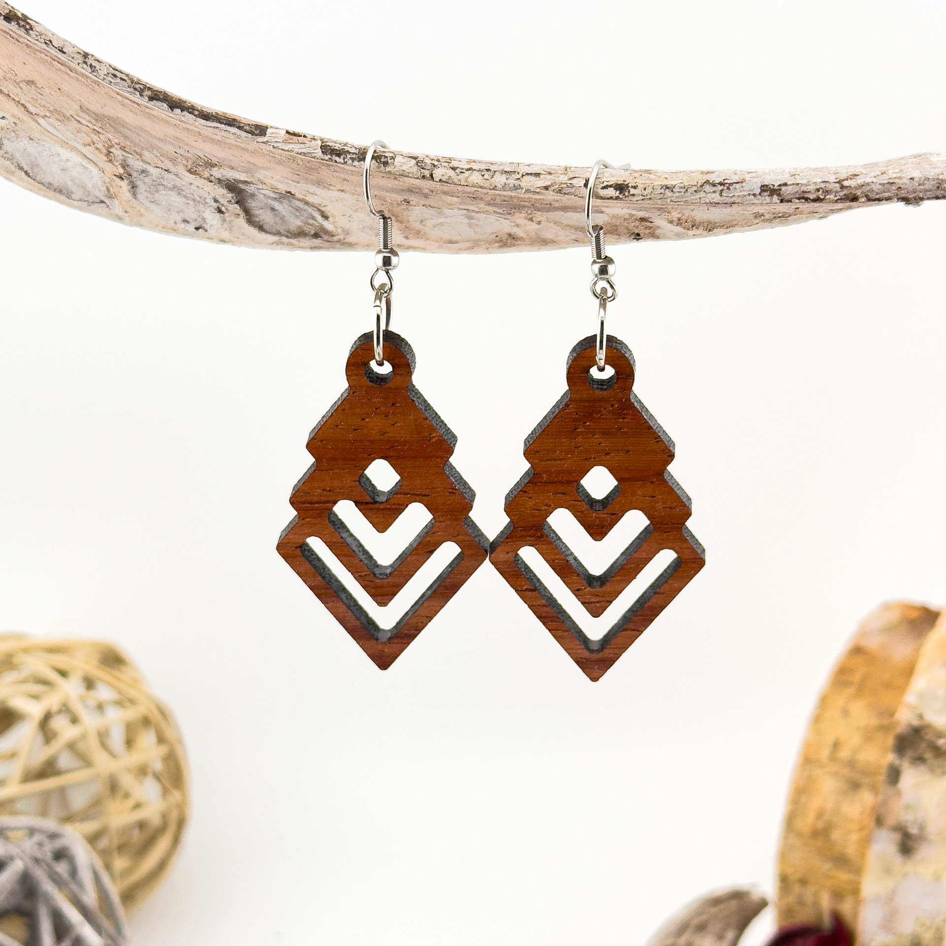 Kolczyki drewniane, drewno egzotyczne padouk, bigle ze stali chirurgicznej, projekt 30
