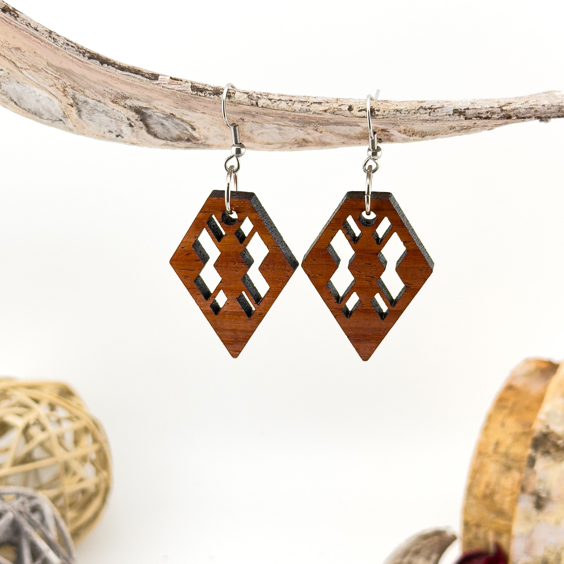 Kolczyki drewniane, drewno egzotyczne padouk, bigle ze stali chirurgicznej, projekt 34