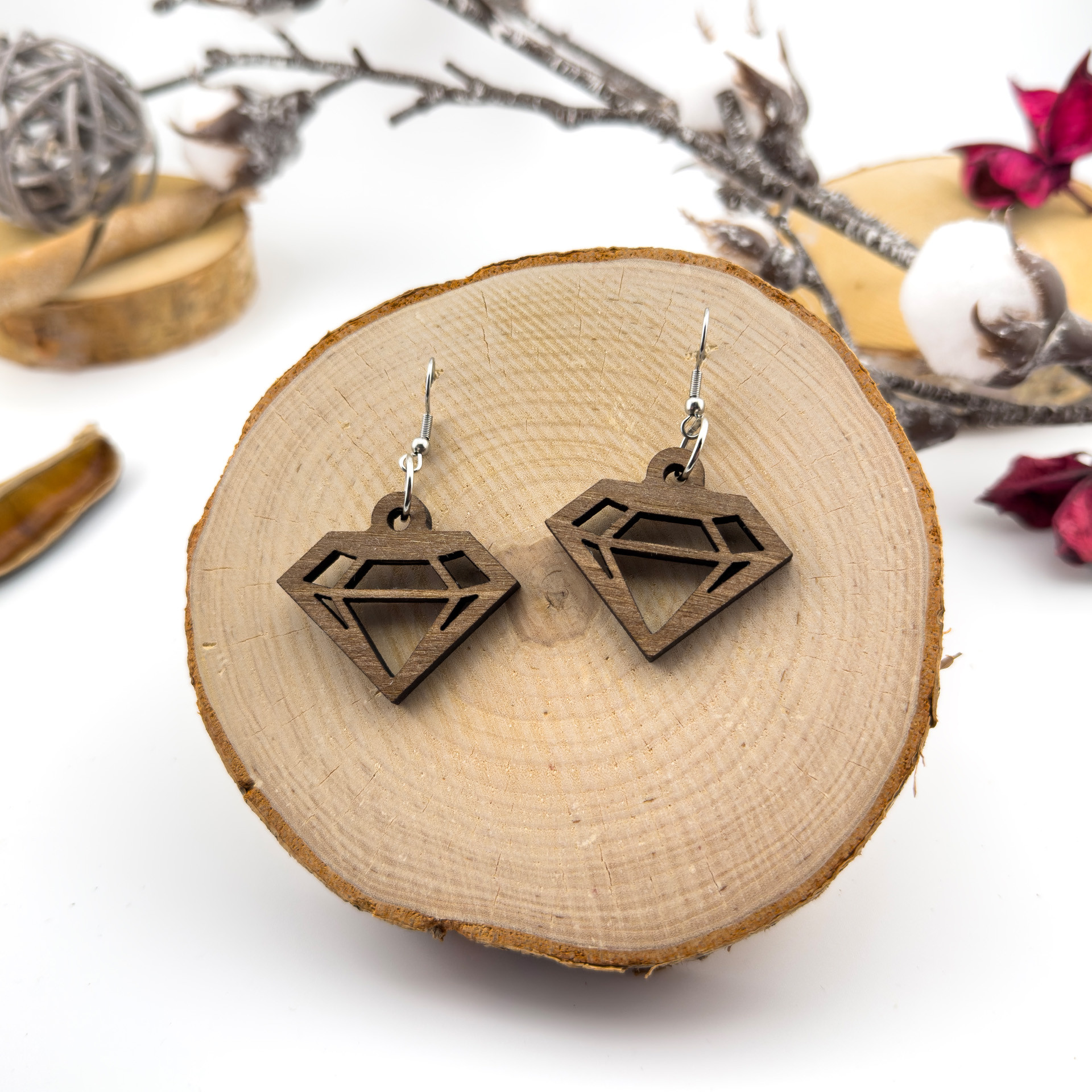 Kolczyki drewniane, orzech włoski, bigle ze stali chirurgicznej, projekt 38