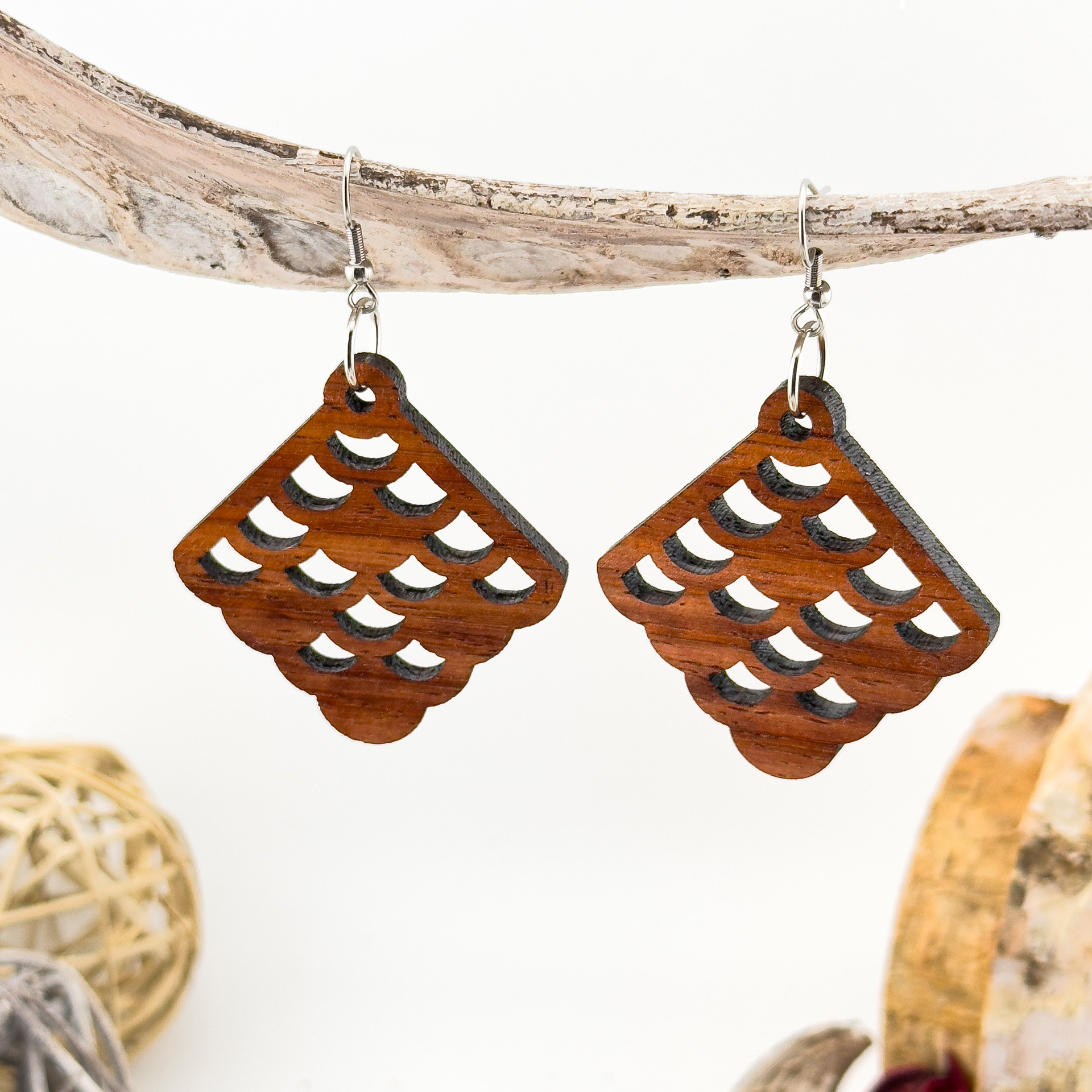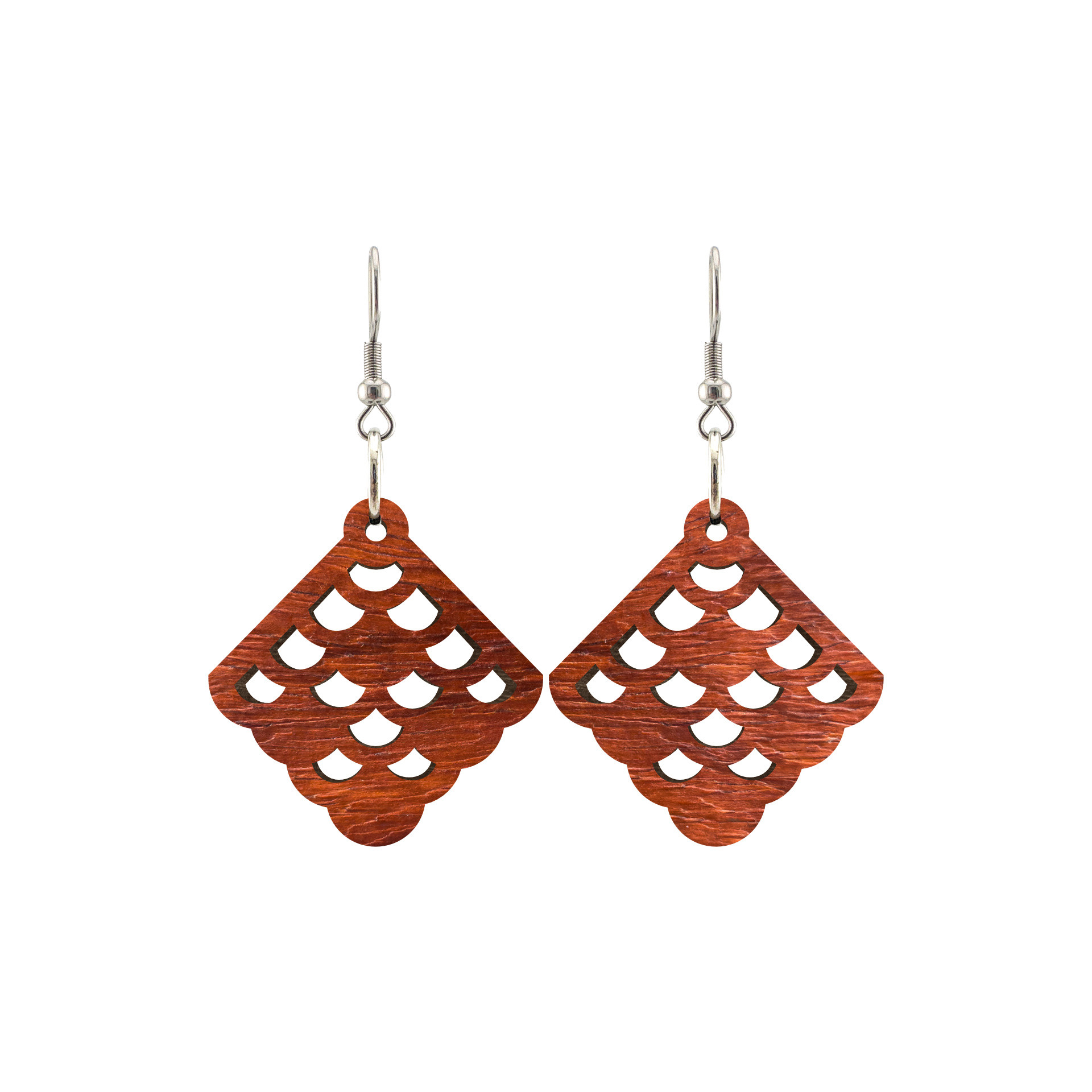 Kolczyki drewniane, drewno egzotyczne padouk, bigle ze stali chirurgicznej, projekt 42
