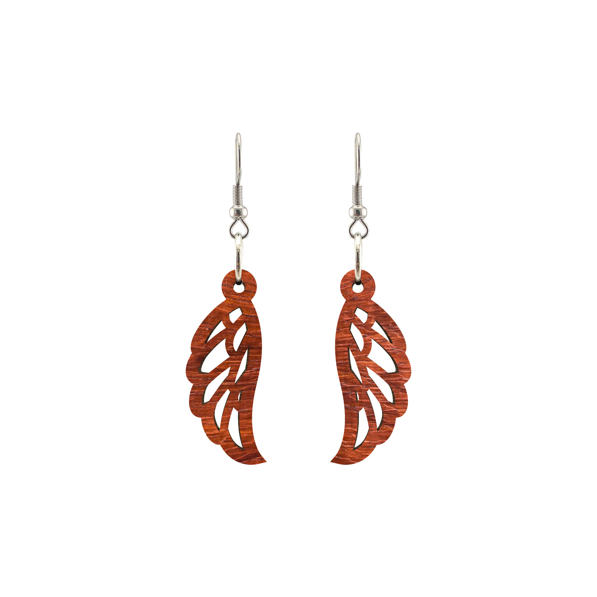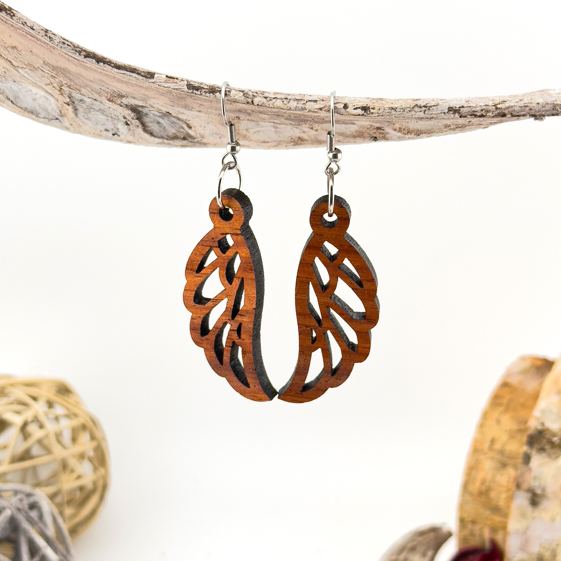 Kolczyki drewniane, drewno egzotyczne padouk, bigle ze stali chirurgicznej, projekt 43